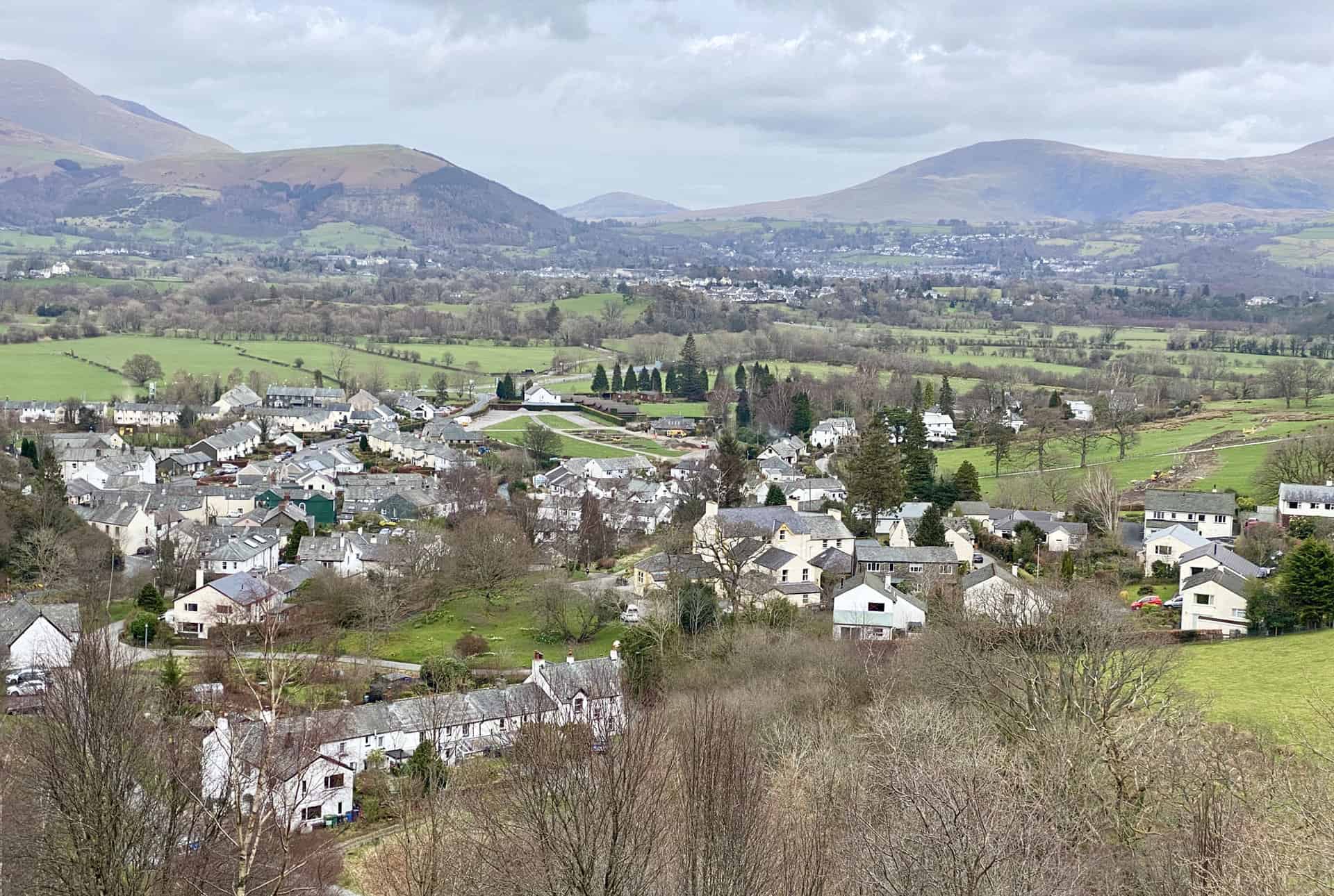 The village of Braithwaite at the end of the Causey Pike walk, with Portinscale and Keswick in the background.