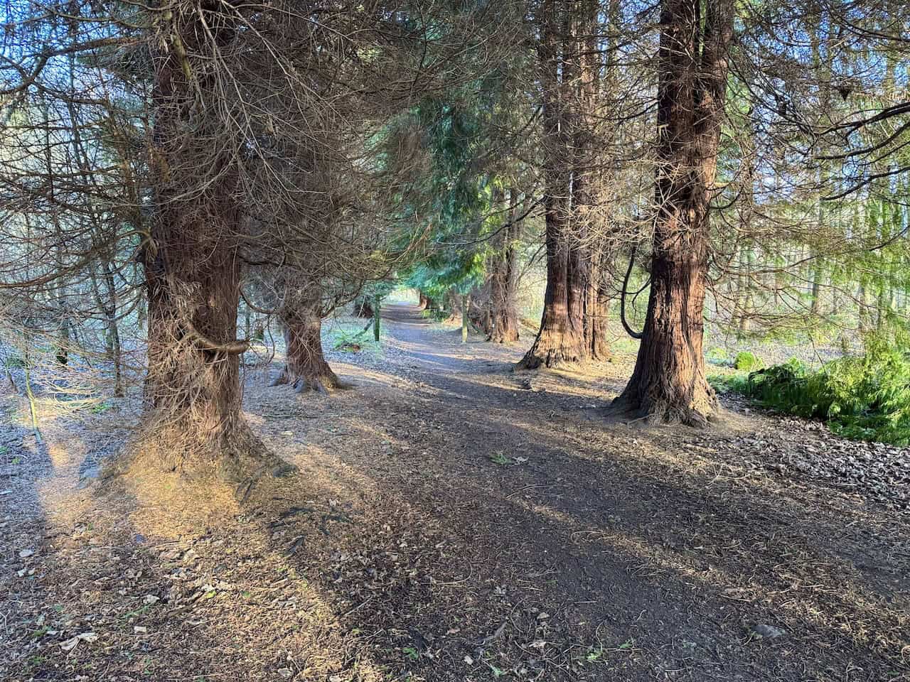 This stretch of the path is lined with towering trees with thick trunks. Sunlight filters through the branches, casting patterns on the ground and illuminating parts of the trail. I wish this path were longer, but sadly, it is only a short section.