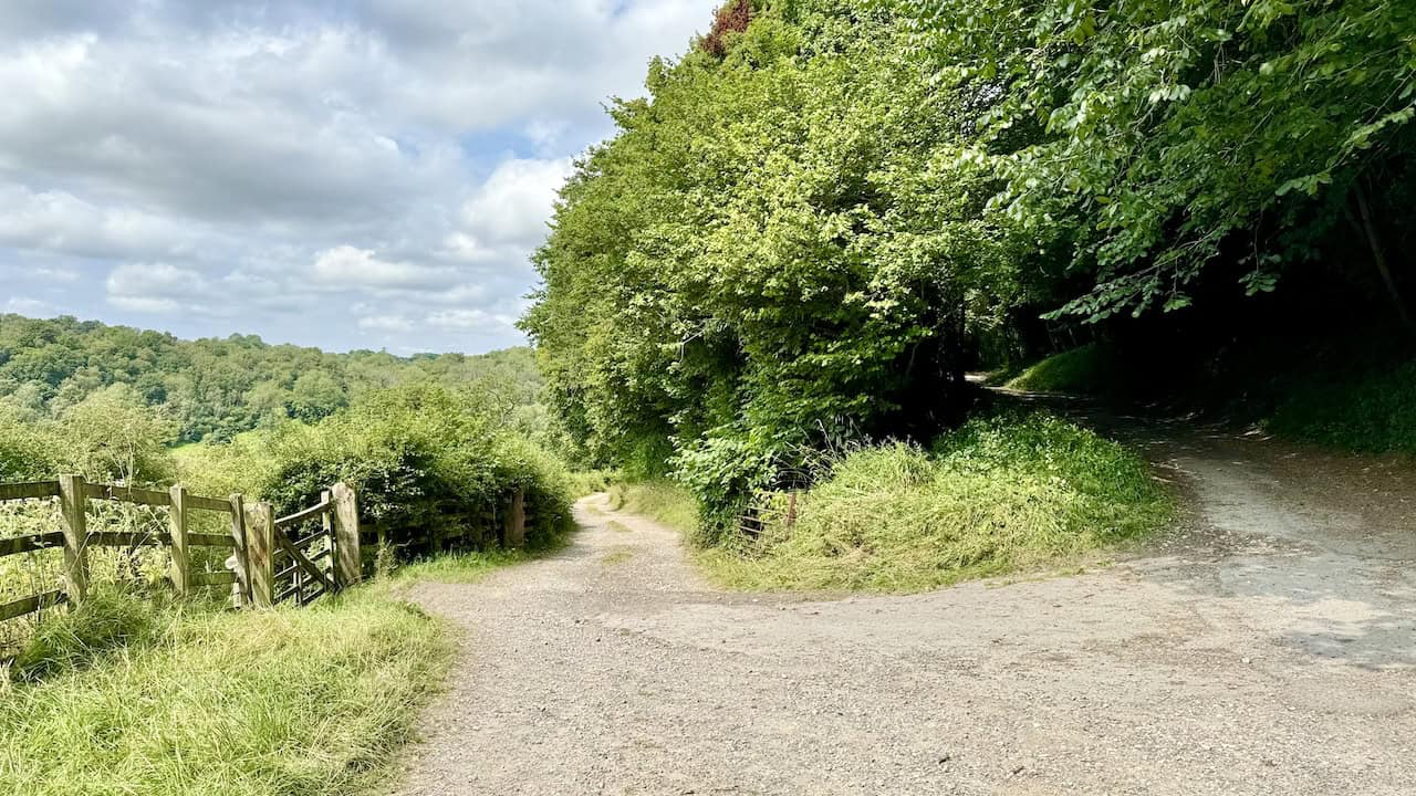 From the chapel, our track ascends towards Air Bank Wood. Shortly, we encounter a fork and take the right-hand track uphill, avoiding the left-hand track leading downhill through gates to a private residence.